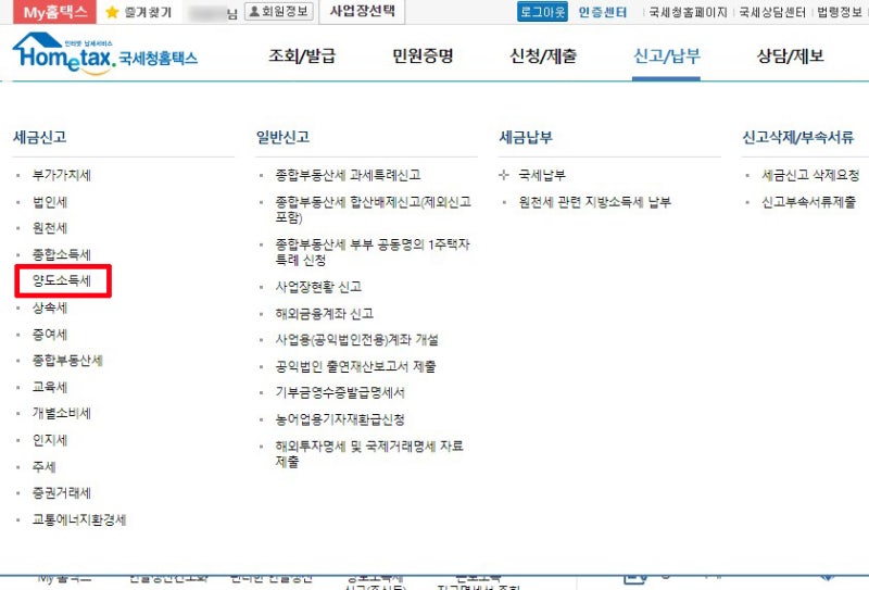 - 신고/납부 메뉴 선택: 메인 화면에서 '신고/납부' → '양도소득세'를 선택하세요.