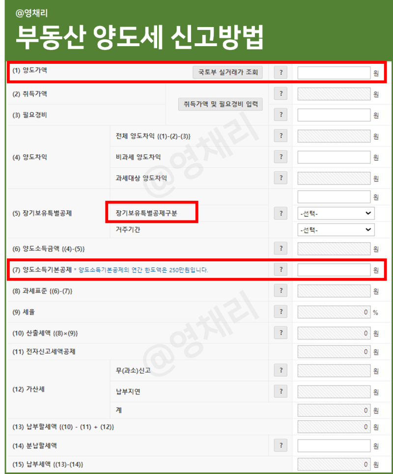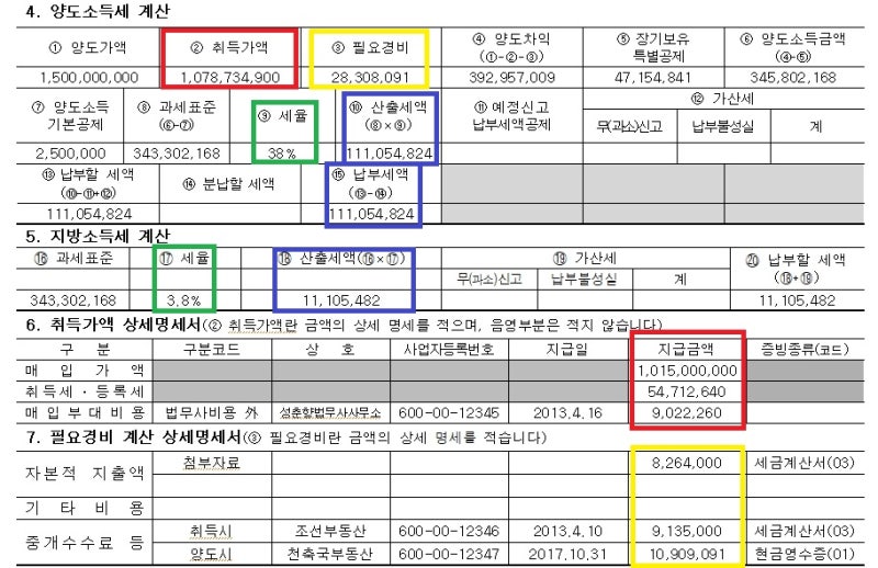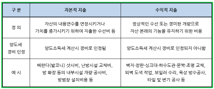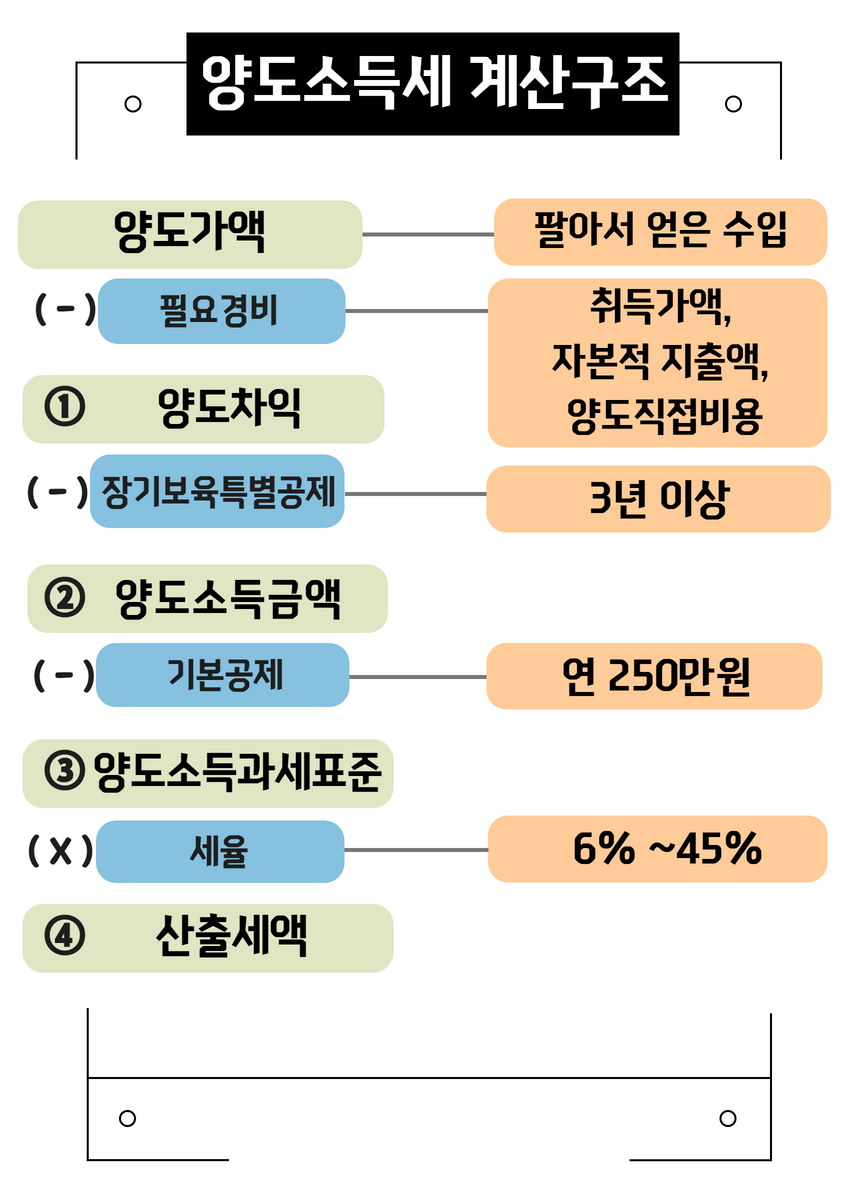 - 필요경비: 중개수수료, 법무사 수수료, 취득세, 등록세 등 자산을 사고파는 데 들어간 비용