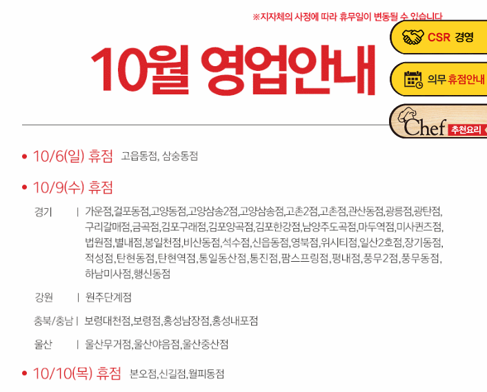 - 10월 12일 (일요일): 둘째 주 일요일 정기 휴무 매장