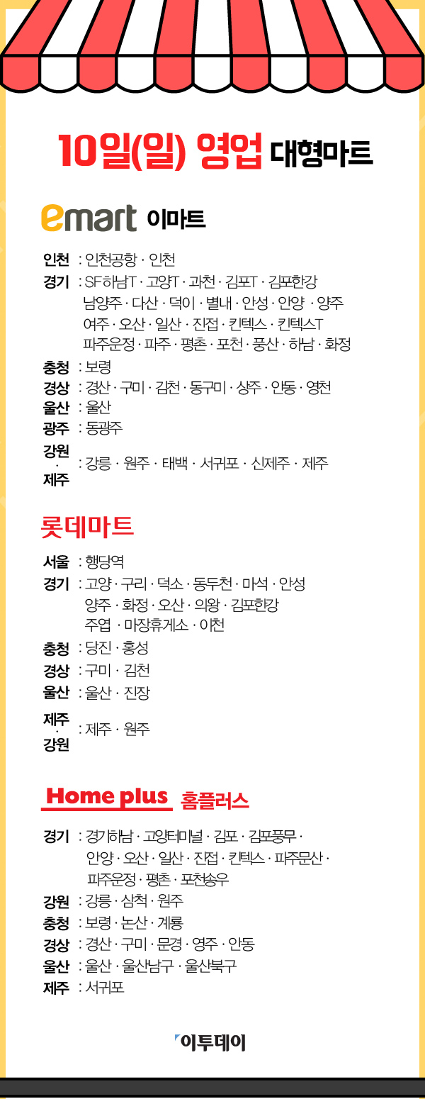 | 10월 12일 (일) & 26일 (일) | 전국 대부분의 이마트 매장 | 정기 의무 휴무일 |